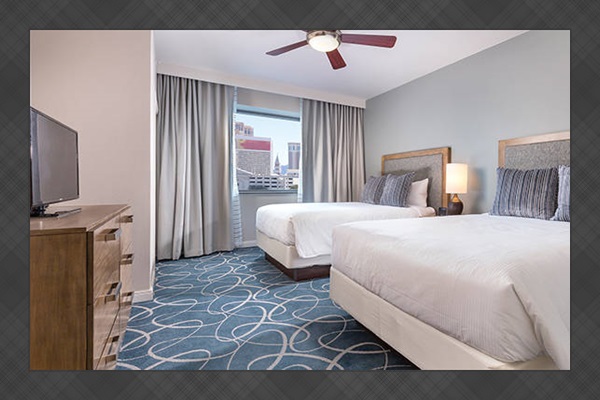 This spacious two-bedroom deluxe suite measures approximately 1,050 - 1,300 square feet and features one king bed in the master and two full beds in the guest room with a queen sleeper sofa in the living area. You will appreciate the convenience of a full kitchen, separate living/dining areas, washer/dryer and whirlpool tub. Maximum occupancy is eight.(Please note: Photos are representations of the units provided and the actual unit is assigned by the resort at check-in.)