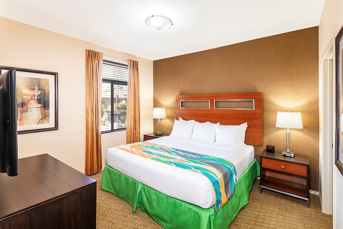 This spacious one-bedroom resort suite measures approximately 911 square feet. You will enjoy a king bed in the master bedroom and a queen sleeper sofa in the living room. Additional amenities include a full kitchen and dining area, and washer/dryer. Maximum occupancy is four. Private sleeping area sleeps two. We guarantee your stay will be amazing! (Please note: layouts/furnishings differ from our stock photos in the listing. There are multiple units at the The Cliffs at Peace Canyon Resort that the resorts assigns the rooms so we cannot guarantee views.)
