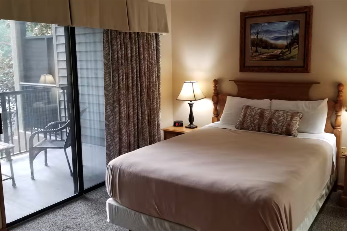 This spacious one-bedroom resort suite measures approximately 605 square feet. You will enjoy a queen bed in the private bedroom and one queen sleeper sofa in the living area. Additional amenities include a full kitchen, a dining area, a fireplace, and a balcony. Maximum occupancy is four. Private sleeping area sleeps two. We guarantee your stay will be amazing! (Please note: layouts/furnishings differ from our stock photos in the listing. There are multiple levels at the Tree Tops Resort that the resorts assigns the rooms so we cannot guarantee views.)