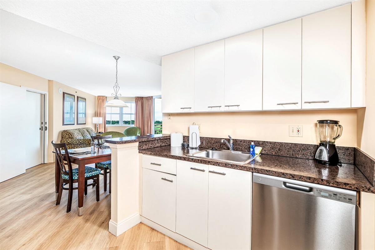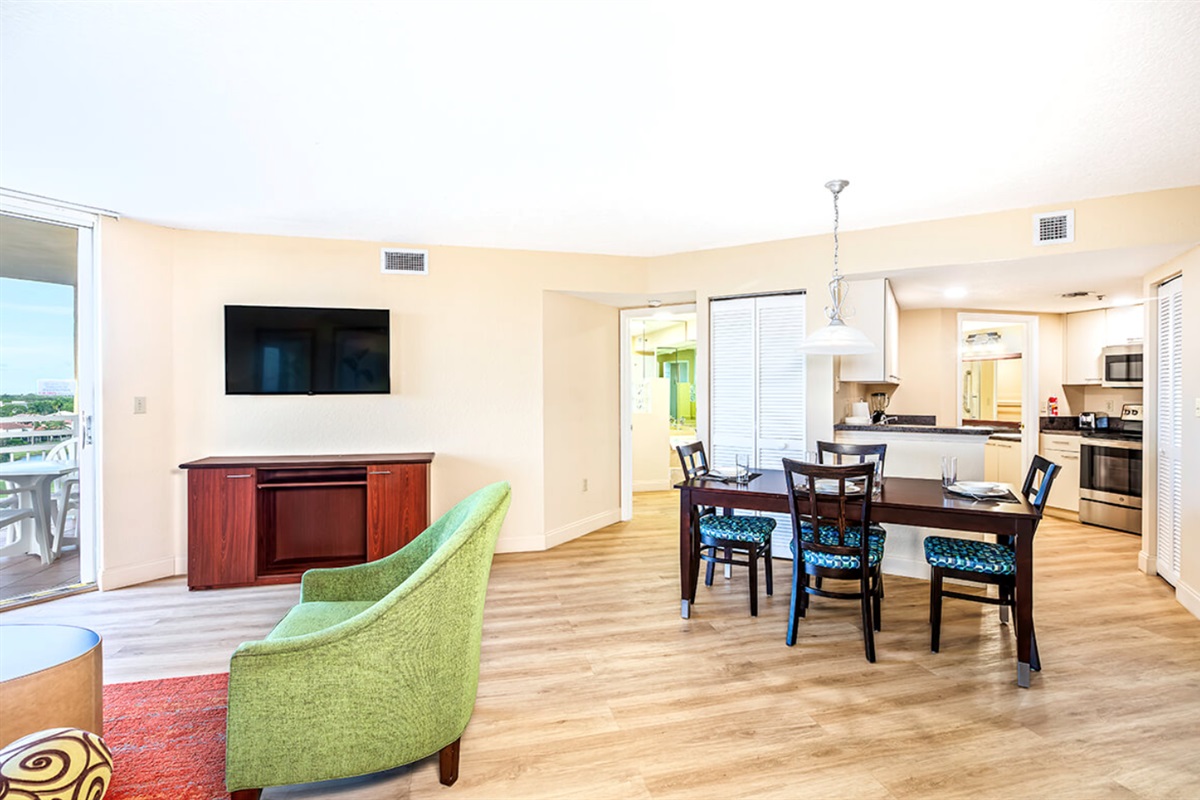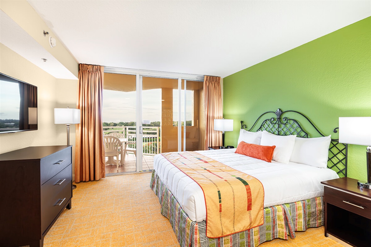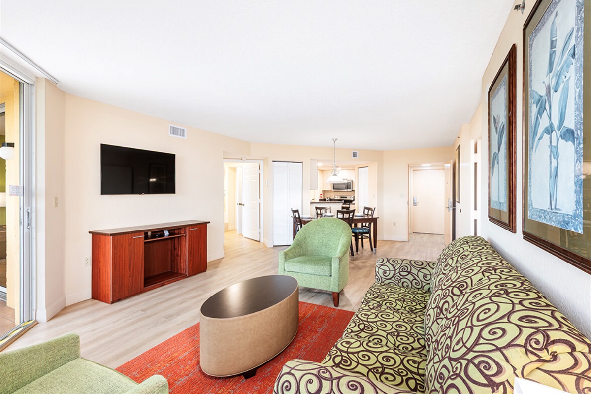 This spacious two-bedroom resort suite measures approximately 1025 square feet. You will enjoy a king bed in the bedroom and a queen sleeper sofa in the living room. Additional amenities include a full kitchen and dining area, and a balcony/patio. Maximum occupancy is four. Private sleeping area sleeps two. We guarantee your stay will be amazing! (Please note: layouts/furnishings differ from our stock photos in the listing. There are multiple units at the Vacation Village at Bonaventure Resort that the resorts assigns the rooms so we cannot guarantee views.)