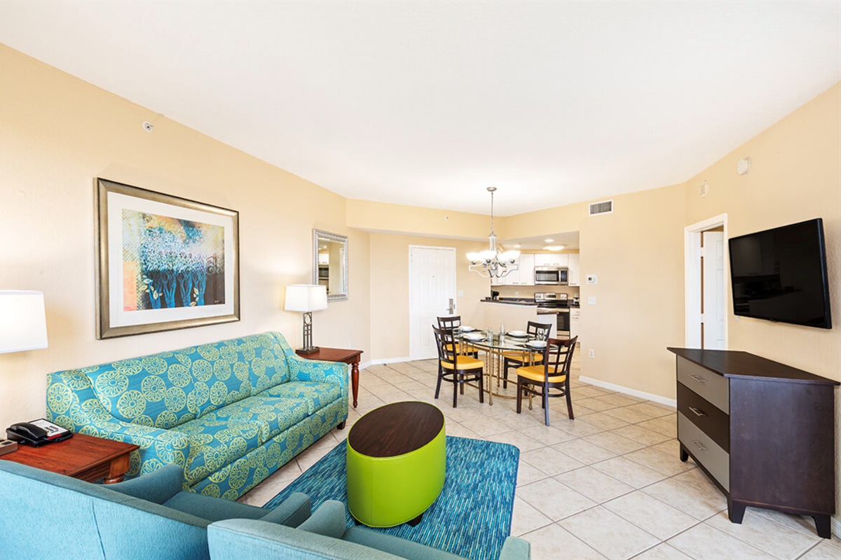 This spacious one-bedroom resort suite measures approximately 800 square feet. You will enjoy a king bed in the master bedroom and a queen sleeper sofa in the living room. Additional amenities include a partial or full kitchen (based on availability) and dining area, and a balcony/patio. Maximum occupancy is four. Private sleeping area sleeps two. We guarantee your stay will be amazing! (Please note: layouts/furnishings differ from our stock photos in the listing. There are multiple units at the Vacation Village at Weston Resort that the resorts assigns the rooms so we cannot guarantee views.)